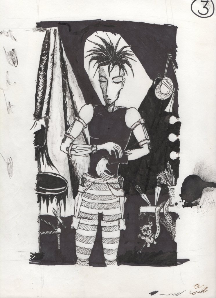 This goes way way back to very beginning, over 20 years ago. Rowan was the first character I created, and originally, the stories were meant to be about him and knife-throwing act. The costume he wears was very Jhonen Vasquez meets Tim Burton, with a burgundy swallowtail jacket, torn black shorts, black and white striped nylons and knee-high Doc Martens.