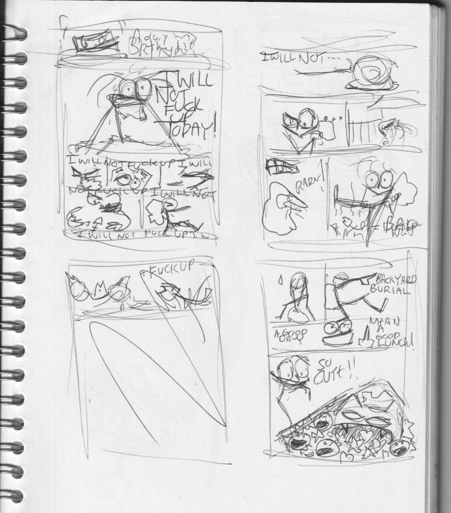This entire story began as a 3 minutes animated sequence (imagined) to the tune of ‘Nothing Gonna Stop’ by Folk Implosion. Lots of ideas, not a lot of drawings that actually go with this.