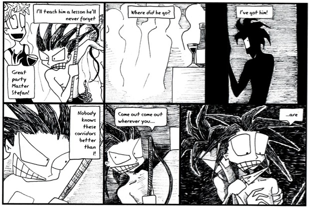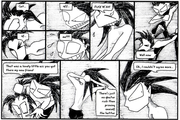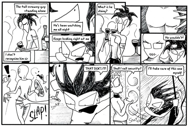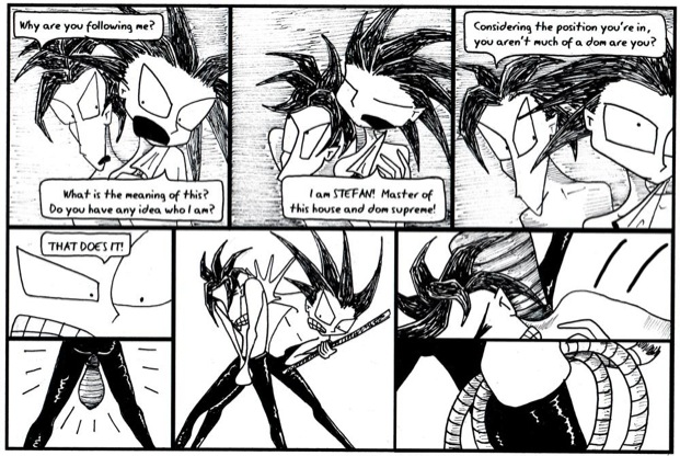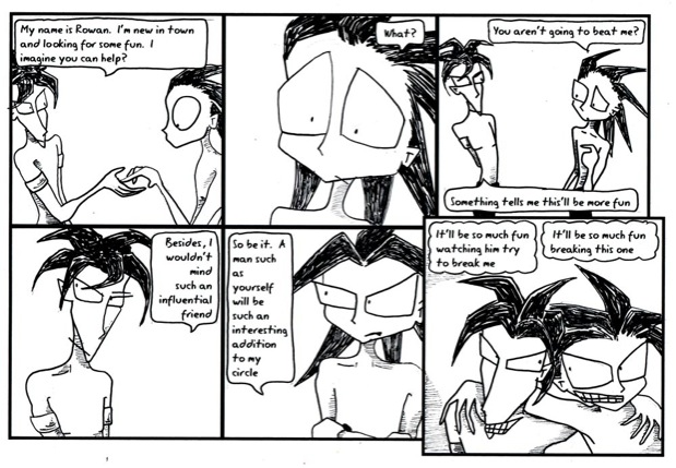 This is one of the few stories I did up about 10 years ago. The first half hasn’t changed, but the short story had a better ending. This is also back in the days I was still drawing Stefan in a way that made him look like a kid. It wasn’t intentional, just a bad habit I’ve been forcing myself out of. Yes, Stefan is quite small, but he’s meant to look much more male! Rowan is bang on in this though.